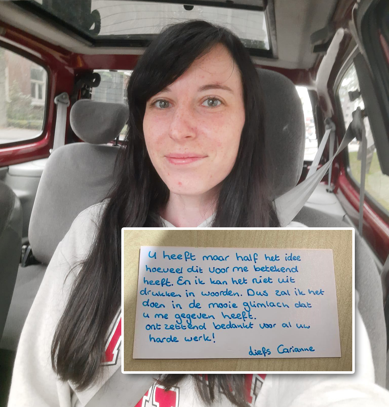 “U heeft maar half het idee hoeveel dit voor me betekend heeft. En ik kan het niet uitdrukken in woorden. Dus zal ik het doen in de mooie glimlach dat u me gegeven heeft. Ontzettend bedankt voor al uw harde werk!” - Carianne